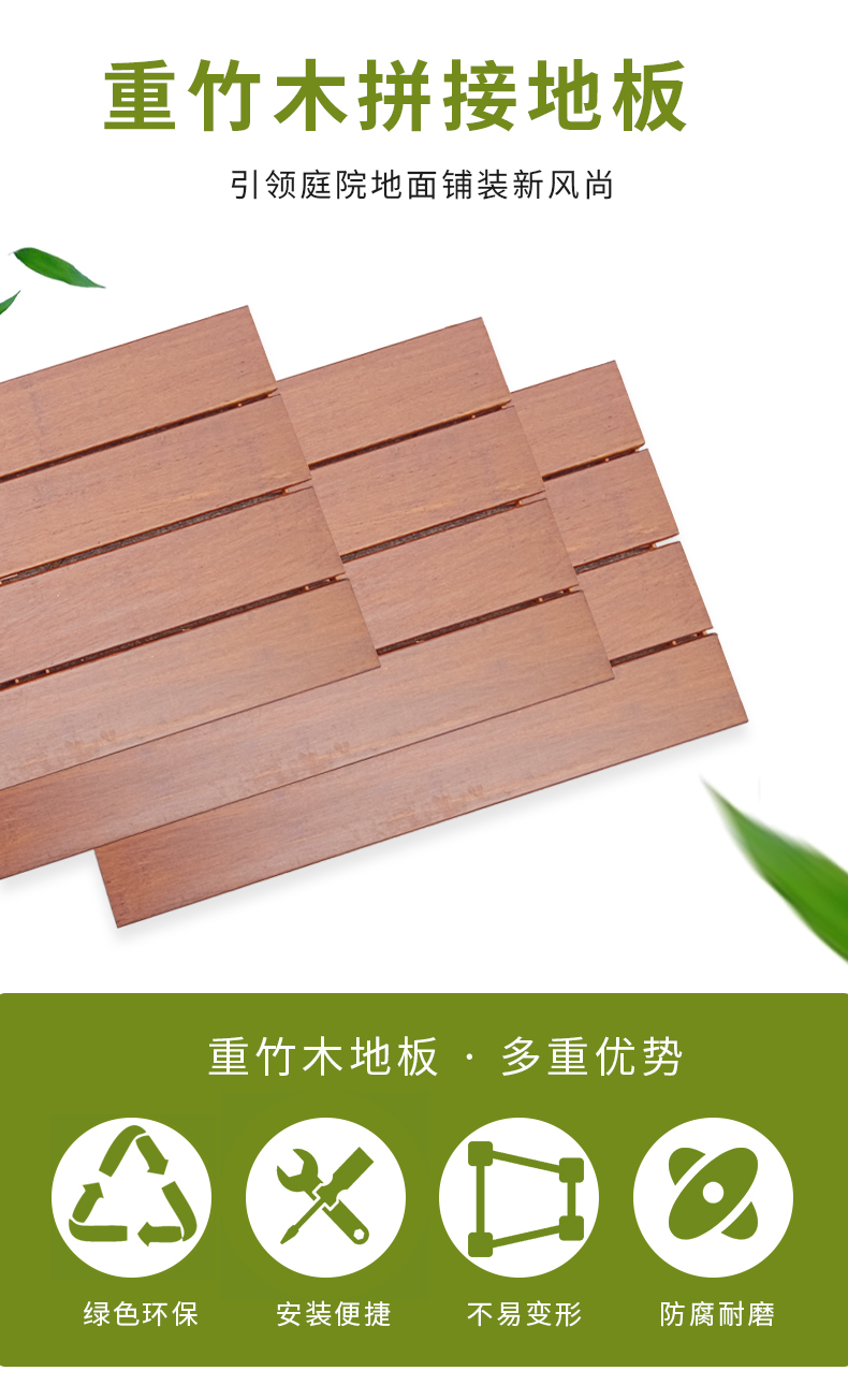 桃花江重竹木拼接地板是使用重竹防腐材料加工而成,具有绿色环保、耐腐防滑、安装便捷、不易变形开裂,超长耐用等特点,可广泛应用于阳台、露台、庭院、花园、浴室和阳光房等。